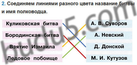 2. Соедини линиями разного цвета название битвы и имя полководца.